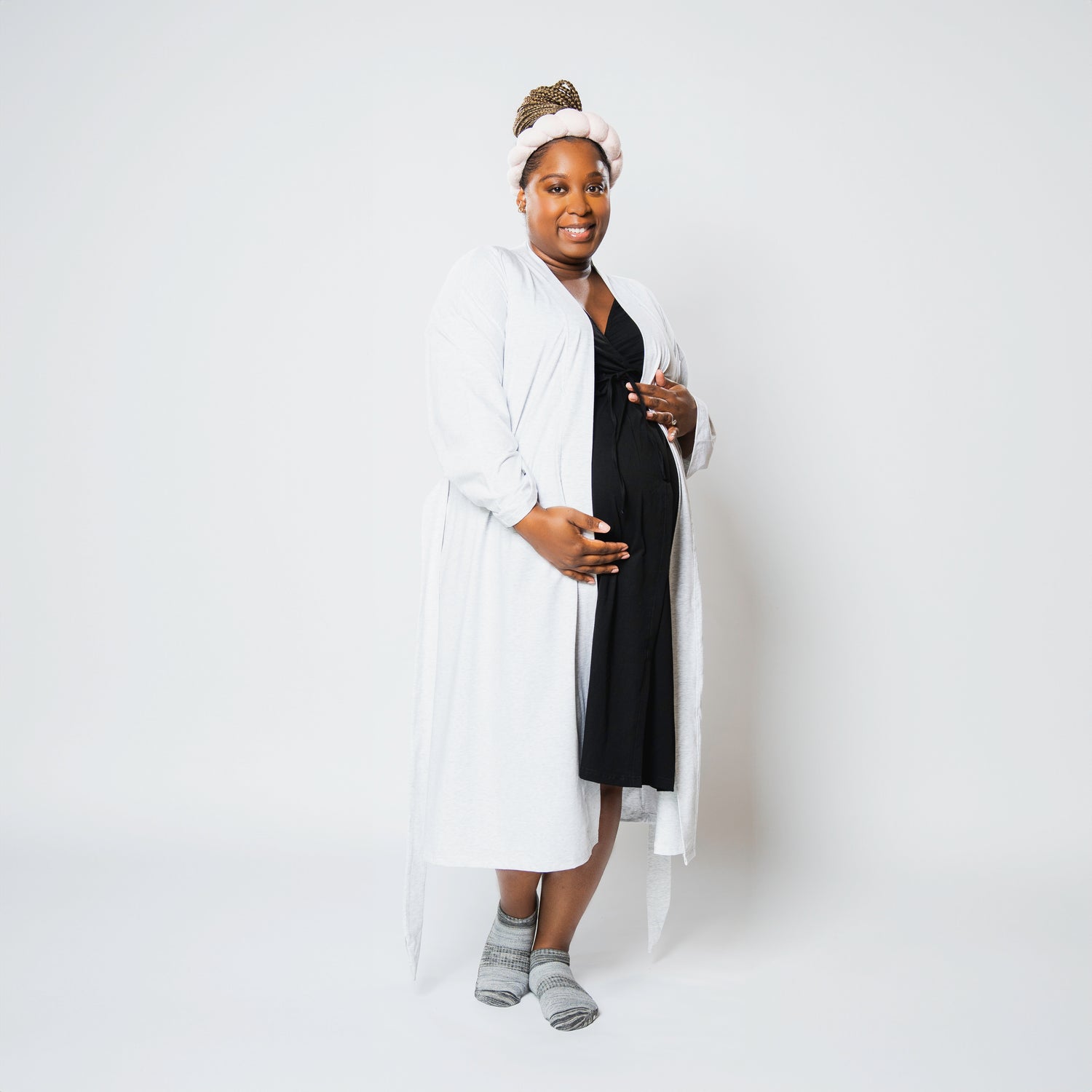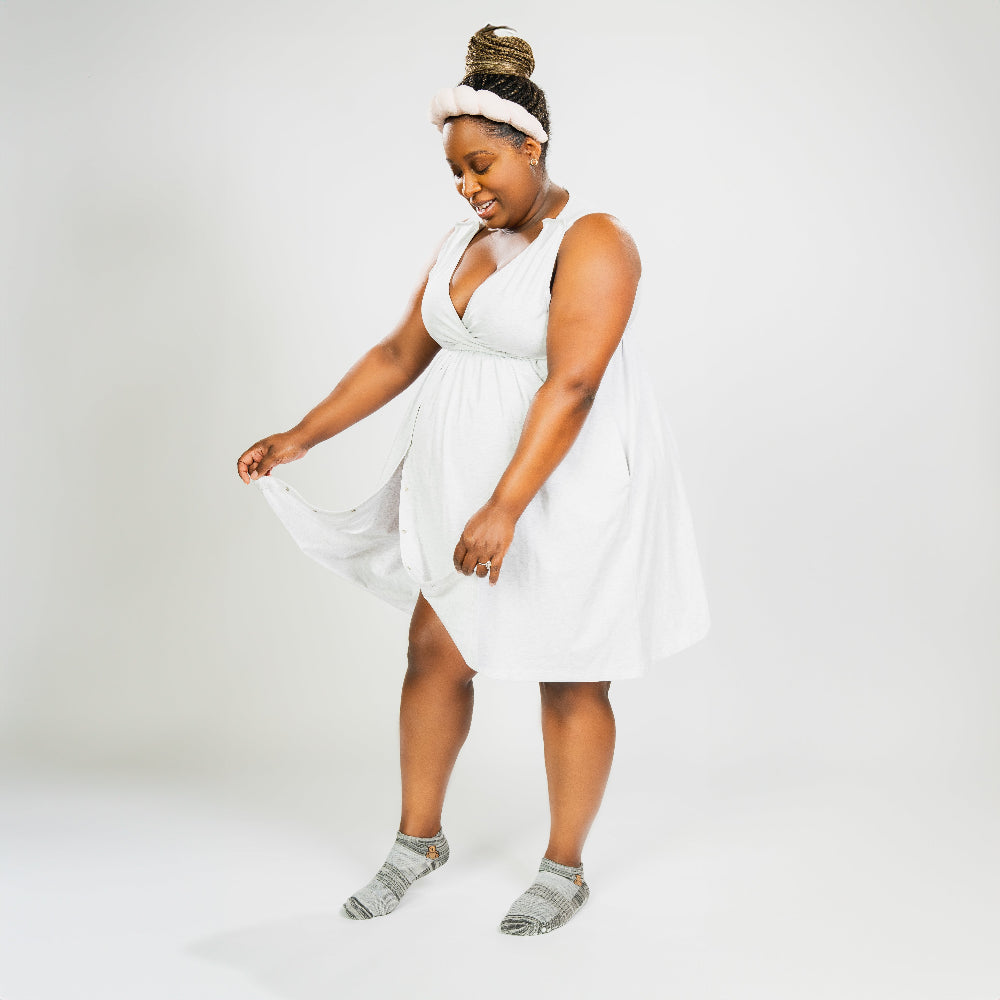Layer with ease—our labor dress, robe, and socks are made to go together