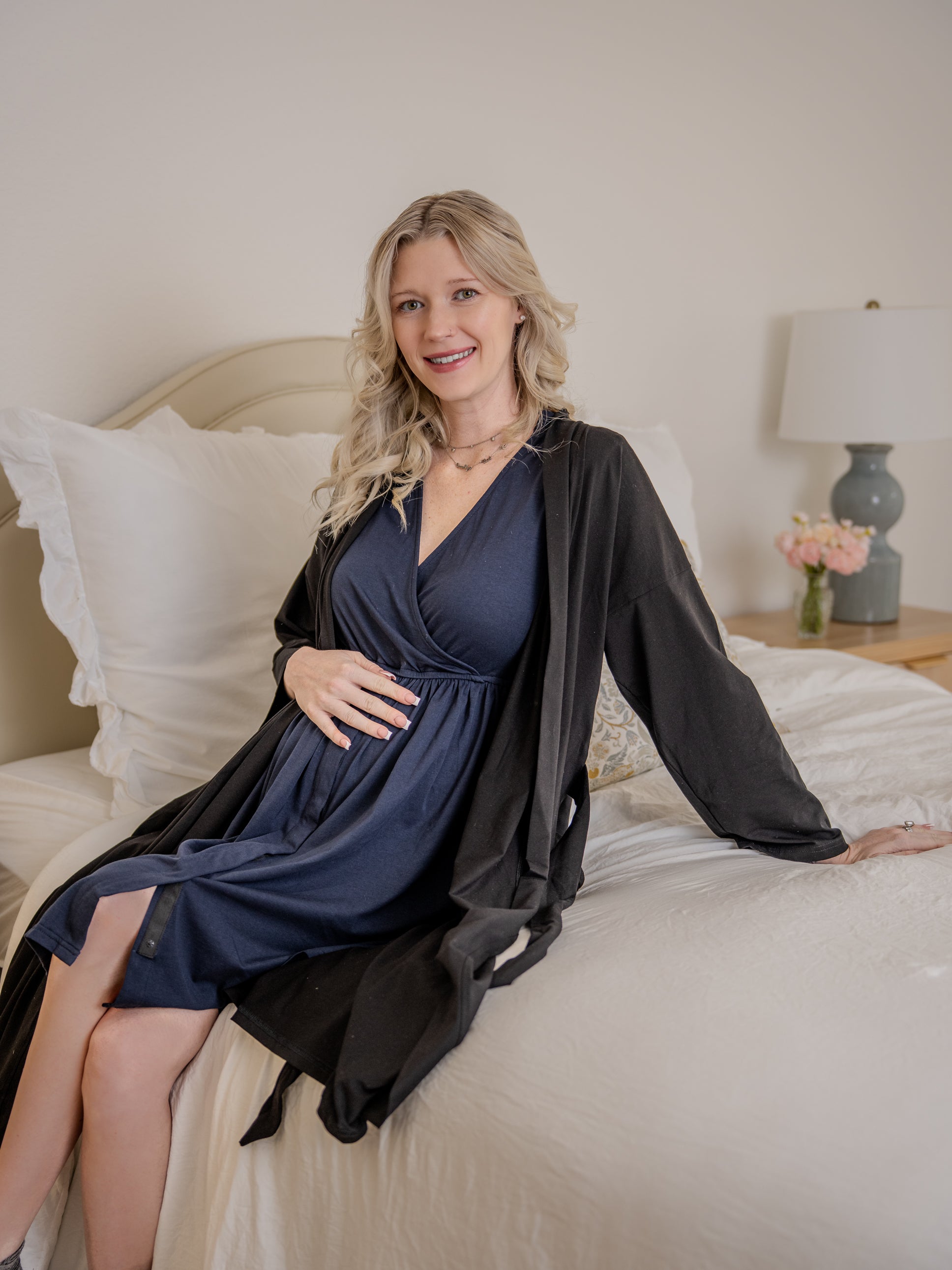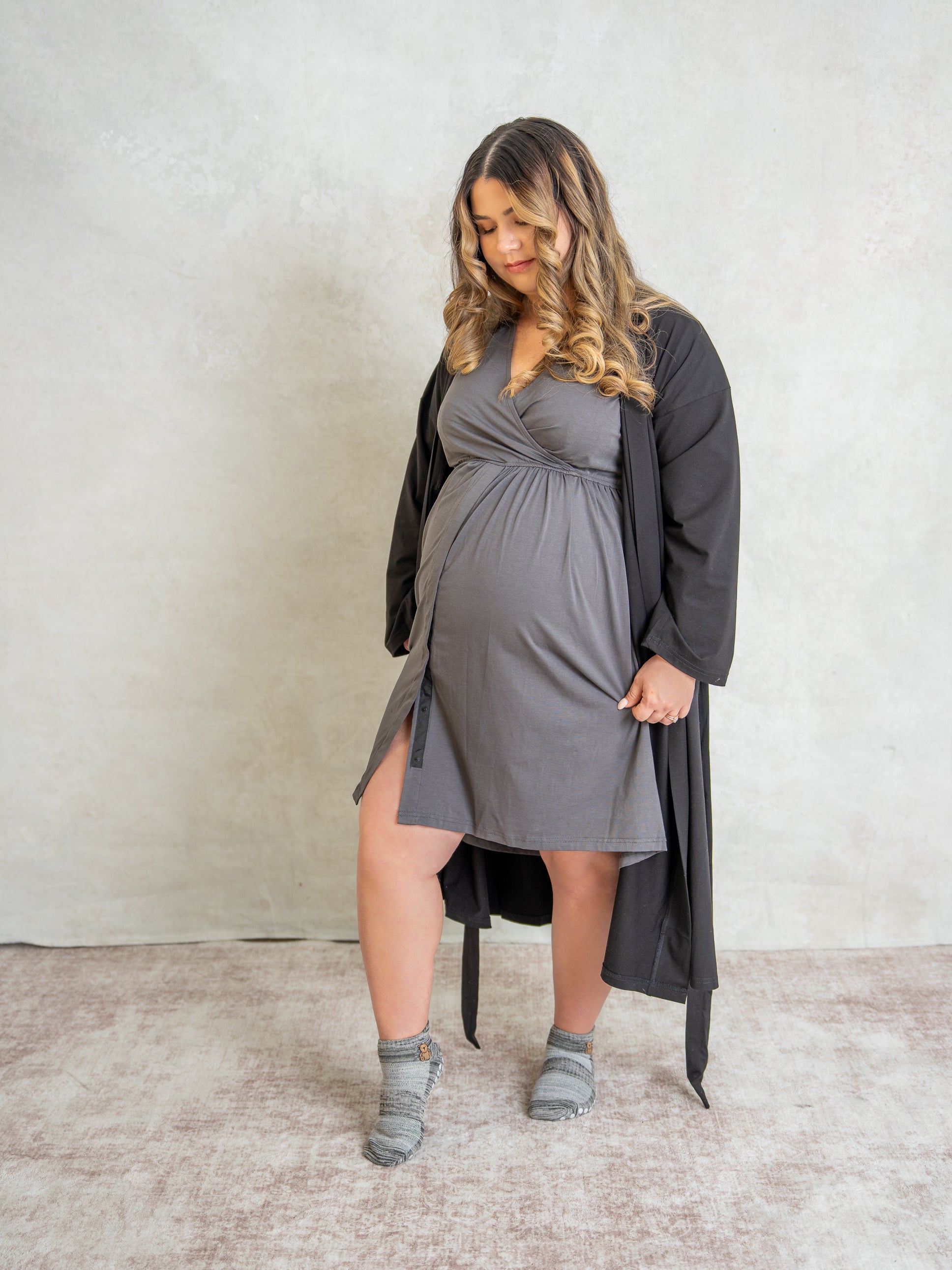 Hospital gowns are often stiff and impersonal—our 3-in-1 dress offers softness, coverage, and easy nursing access. Designed for labor, delivery, and beyond, it helps you feel like you during one of life’s biggest moments.