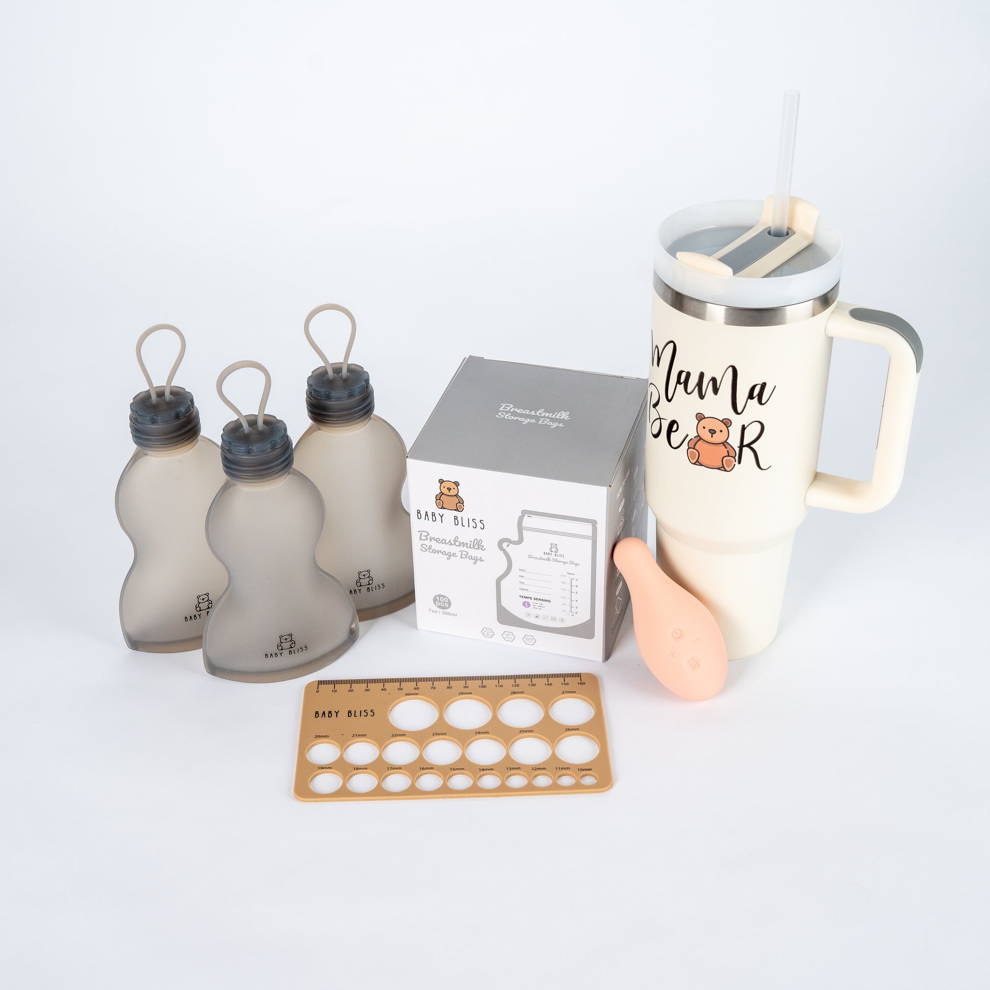 Breastfeeding Essentials Set with Milk Storage Bags, Flange Ruler, Lactation Massager & Hydrating Tumbler