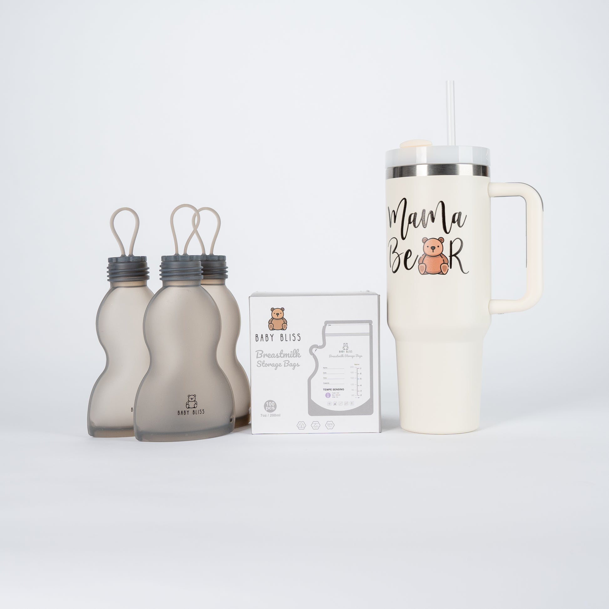 Breastfeeding Essentials Set with Temperature-Sensing Storage Bags, Reusable Milk Bags (3-Pack) & Hydrating Tumbler